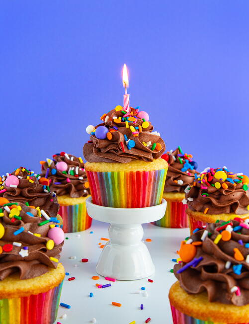 Celebrate good times with cupcakes! There’s a party going on right here, and we are bringing the fun and the dessert. These birthday cupcakes are the classic combination of yellow cake with a creamy chocolate buttercream frosting. Adding a ton of rainbow sprinkles and 16 candles will put these treats over the top. So, what’s your pleasure? Totally these cupcakes!