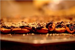 - Spray a baking sheet with nonstick baking spray. Lay out almonds in a single layer on baking sheet. Pour hot, melted chocolate mixture on top of almonds. Sprinkle with sugar.