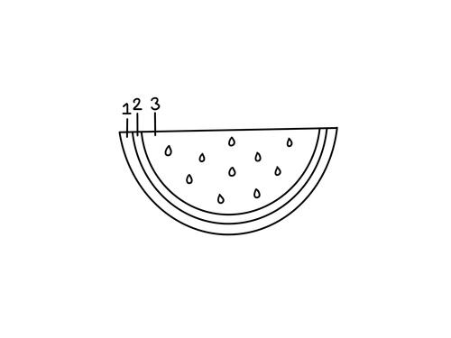 On the illustration, you see numbers 1 through 3; that is the order of piping the colors. Use the dark green macaron batter first to fill in the outer rim of the watermelon (number 1) for all the macarons.