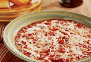 Spread the ricotta cheese in an even layer in a 9-inch pie plate. Top with 1/4 cup of the pepperoni and 1/2 cup mozzarella cheese.