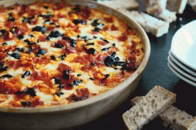 My husband and I had a few friends over last week for video game night after my 4 year old went to bed, and everybody loved this dip! I made it half and half, just like we get at our favorite pizza place. Mega meats on one side, and ham, pineapple, and green pepper on the other. I served it with garlic crostini. Next time I will prepare 2 batches, because it disappeared quickly!