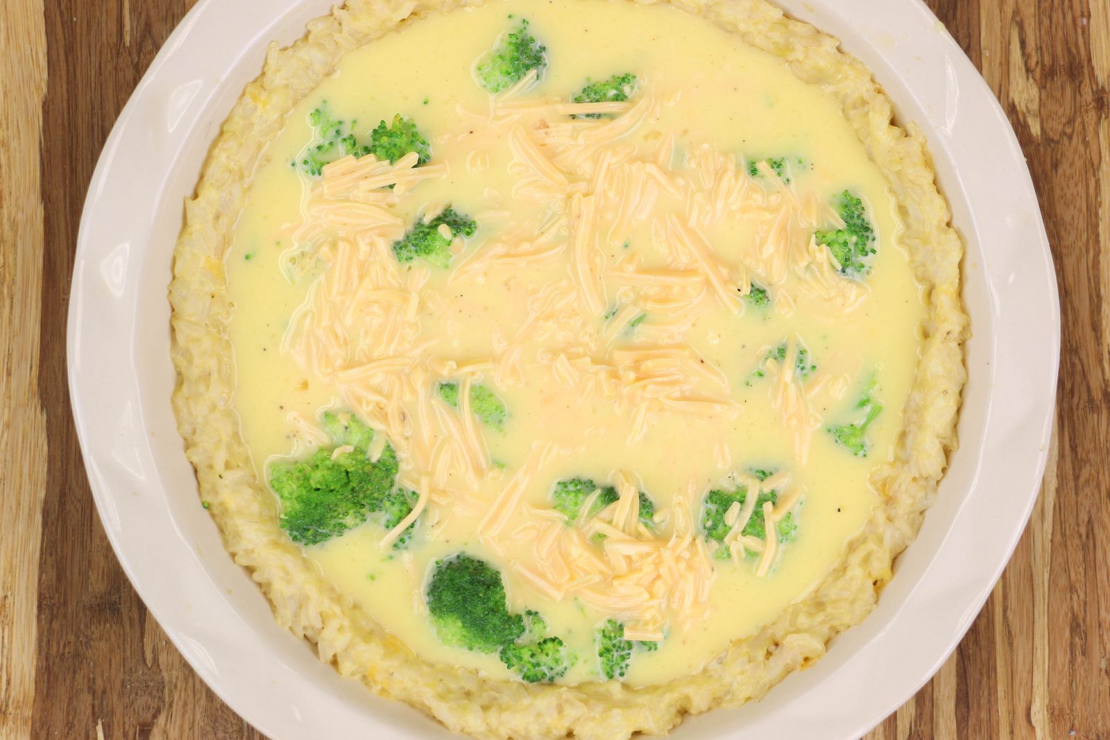 - In the bottom of the crust, layer the broccoli and cheeses. Pour the egg mixture over and sprinkle the chopped green onions and extra Cheddar and Parmesan cheese on top.
