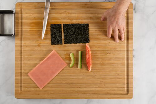 Place the nori horizontally on a cutting board. With your knife, cut off one-third of the nori and save for another use.