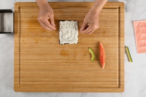 Turn over the nori, place the imitation crabmeat, cucumber and avocado in the middle and roll up the roll.