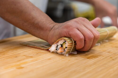Cover the roll with a makisu (bamboo mat) and press down with your palms while pressing in with your fingers to create a wave shape. From the side, it should look like half of a heart.