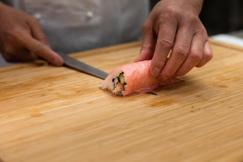 Cut the excess of the red soy sheet, moisten your knife blade with temizu and swipe the tip of your knife under the roll to separate it from the cutting board.