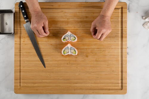 At my school, the Sushi Chef Institute, I host sushi workshops once a month. These workshops are for people who want to learn sushi in a nonprofessional capacity, and since we usually only have a couple of hours, I like to incorporate unique and fun activities. Most people know rolls, but they don’t know that rolls can be shaped into other things. This heart-shaped roll is simple to make but it always makes a good impression. I love to teach this roll to first-time sushi makers since it’s a great gift they can make for their loved ones. I hope to see you at my school someday so we can make and eat sushi together.