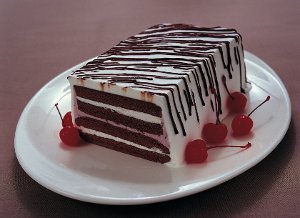 When ready to serve, remove from the freezer. Dip a fork into the melted chocolate and wave it over the cake to form decorative stripes. Garnish the top of the cake and the platter with maraschino cherries. Slice and serve.