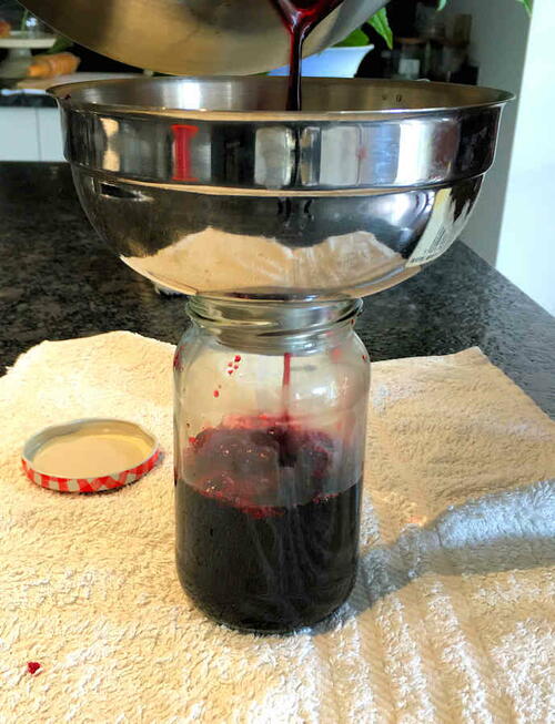 Otherwise place a colander over a tall pot (you can use the same pot you cooked the blackberries in, rinsed, while the blackberries have been decanted to a bowl). Make sure there is enough clearance between the colander and the bottom of the pan, so the juice can drip freely. Additional scaffolding using a cake pan ring or something similar might be useful. Line the colander with a double layer of muslin. -