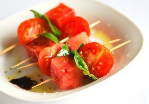 Try these at your next party for an easy, refreshing, and rewarding appetizer recipe. Cubes of seedless watermelon are paired with fresh basil leaves and a cherry tomato. A fruity take on the popular Caprese salad, you'll love this summer treat.