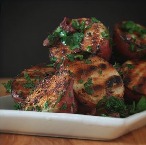 Slice the potatoes in half. (If your potatoes are a little large, slice them in quarters.) Place 1-2 tablespoons of oil on a plate and dip the cut sides of the potatoes in oil. Grill them on an indoor cast iron grill or outdoor grill just until the cut side is crisp and has nice grill marks on it.
