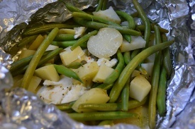 Place green beans over the potatoes and add 1/4 cup of wine. Sprinkle with salt and pepper as desired. Fold each side of packet over (short side first), letting it overlap, and then fold long sides over to seal in all juices. Do not flip over.