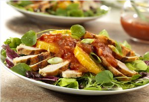 This centerpiece salad features grilled chicken with juicy oranges, black beans, green onion and salad greens, topped with an amazing dressing made with lime juice and garlic. Chicken recipes have never been so good or refreshing.