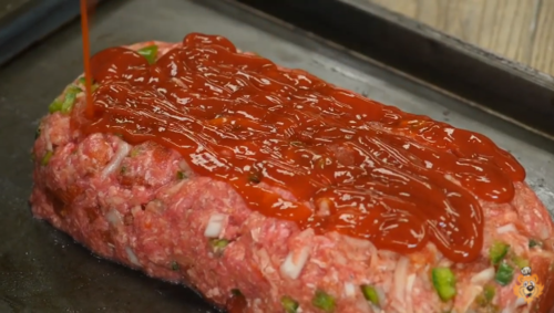 Spray a sheet pan with cooking spray. Place meat on the sheet pan and form into a loaf. Spread the ketchup on top of the loaf.