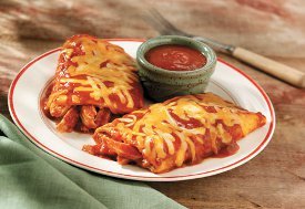 For a Cheesy Enchilada, omit the chicken and use 1 cup cheese. Place 3/4 cup cheese down the center of the tortilla. Top with half the enchilada sauce. Roll up the tortilla and place seam-side down onto a microwavable plate. Top with the remaining sauce and cheese. Microwave as directed above.