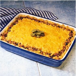 - Bake for 10 minutes. Cool in dish on wire rack. Spoon beef filling into corn meal crust. Spread reserved corn meal mixture over beef filling.
