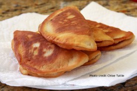 - Put 1-2 Tablespoons cooked peaches in the center of the rolled dough. Fold the edges over to make a half circle. Crimp edges with a fork. Trim off any extra dough.