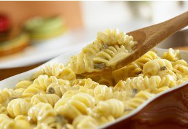 - Stir the soup, cheeses, milk and black pepper in a 1 1/2-quart casserole. Stir in the pasta.