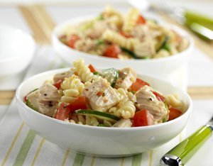Tender pasta, crisp and flavorful veggies, chicken and a quick flavorful dressing...this pasta salad recipe has it all. Refrigerated and cooled, beat the heat with this delicious summertime recipe that is perfect for dinner or a picnic.