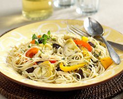 Trying to spice up simple pasta recipes for a weeknight meal? This Easy Mediterranean Angel Hair recipe, made with bell peppers, Kalamata olives, capers, Feta cheese and anchovies, is sure to send you back to the islands of Capri. This fast pasta recipe takes only 30 minutes to make, and you can also serve it cold for a quick summer pasta salad recipe.