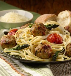 - Prepare a large sauté pan with cooking spray, and brown al fresco Tomato Basil Chicken Meatballs over medium high heat for 4 - 5 minutes. Add the cooked pasta, roasted vegetables, and toss together.