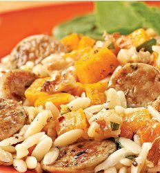 - In a large serving bowl combine hot pasta, sausage, squash and toasted walnuts. Slowly stir in small amounts of the reserved pasta water (if needed to moisten.) Stir in Parmesan cheese and fresh basil.