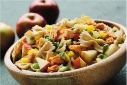 - In a salad bowl, combine pasta, apple, salmon, celery, green onions, zucchini, yellow pepper and baby peas. Set aside.