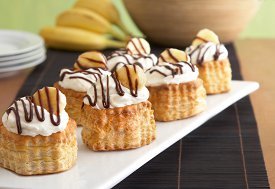 The five ingredients in these Black Bottom Banana Cream Puffs are all you need for an amazingly tasty party dessert. Since each puff is in an individual dessert shell, these homemade cream puffs are perfect for serving your guests. Hot fudge, bananas, pudding, puff pastry and whipped cream: that's all you need to make one of the most delicious dessert recipes of all time. Get the easy instructions from Campbell's Kitchen right here.
