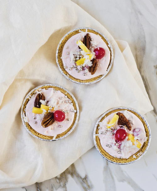 - Whole maraschino cherries, pecans, sweetened flaked coconut, pineapple, and silver sugar pearls for garnish
