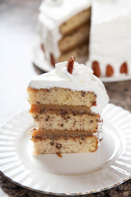 Pecan Pie Cake: Delicate yellow cake filled with a decadent pecan filling. Your favorite Thanksgiving pie in cake form! Must try! Even if you love Thanksgiving dinner you’re going to want to fast forward to dessert for this Pecan Pie Cake. It is HEAVENLY!