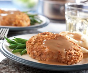 I like this variation of cooking pork chops. I think I would like them crumbed and have never eaten them this way. I'm excited to try it. Personally, I would make my own home-made gravy.These chops look very yummy. I would like to eat them with some nice sweet blanched sugar snap peas.