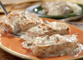 Ranch salad dressing and creamy mushroom soup combine to make a perfectly seasoned sauce to serve over golden, juicy pork chops and rice. A quick and easy recipe for a weeknight meal, this pork chop recipe will become a keeper.