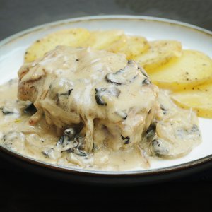 You will layer your dutch oven like this: pork chops, sauteed onions and mushrooms, onion gravy and top with the sliced potatoes.