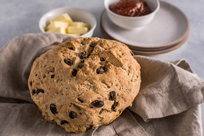 Whether you're Irish or not, this recipe may just find its way into your kitchen as a traditional staple. While traditionally, Irish soda bread omits raisins or currants, we made ours with raisins for a little added sweetness. Because of that, this bread is easy to eat as a light snack on the go or even a dessert with a nice cup of coffee or tea.