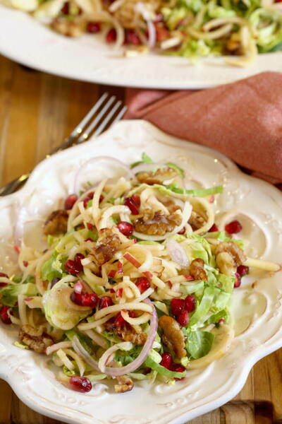 "Shaved Brussels Sprouts Salad with Apples is the perfect fall salad. It is crisp, crunchy, and sweet. Everything about this salad screams different and also healthy but delicious. With layers of shaved brussels sprouts, apples, pomegranates, candied walnuts, and a pomegranate vinaigrette, this fall harvest salad recipe is a winner! This post was created in partnership with Ninja® Intelli-Sense™ Kitchen System with Auto-Spiralizer™. I received complimentary products and compensation to facilitate my review, but all opinions within are my own."
