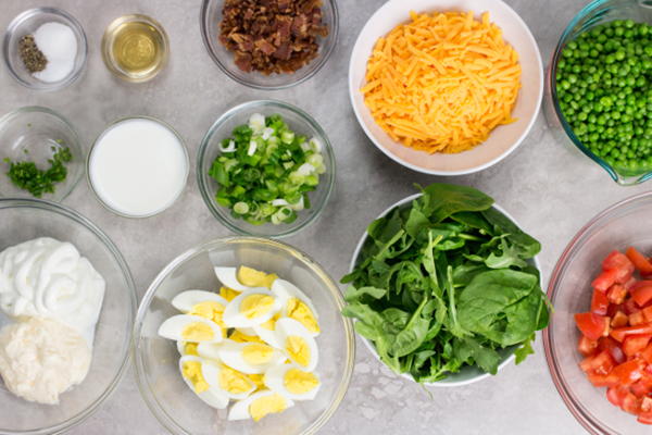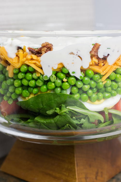 Learn How to Make the Best 7 Layer Salad and you'll have an easy-to-throw-together recipe (seriously!) that will feed a hungry crowd like nobody's business. This is a great recipe to make for parties and potlucks no matter the time of year! Simply layer each element of this salad in a large bowl, and serve. It's as easy as that. This salad has something for everyone, so no one will have anything to fuss about. Plus, this recipe can be easily modified to add or omit any ingredient that you like. Got a vegetarian coming to the party? Skip the bacon. Like romaine lettuce better than spinach? Swap it out. This salad will be your new favorite easy recipe in no time!