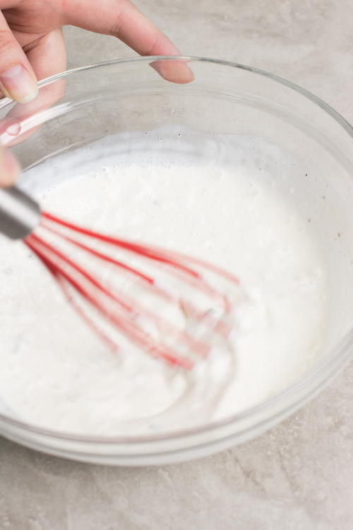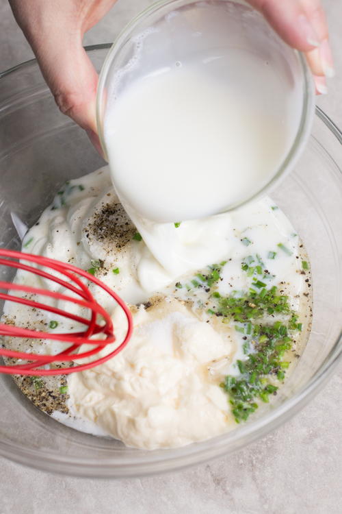 Add mayo, sour cream, buttermilk, apple cider vinegar, chives, parsley, salt, and pepper to a medium to large-sized bowl.