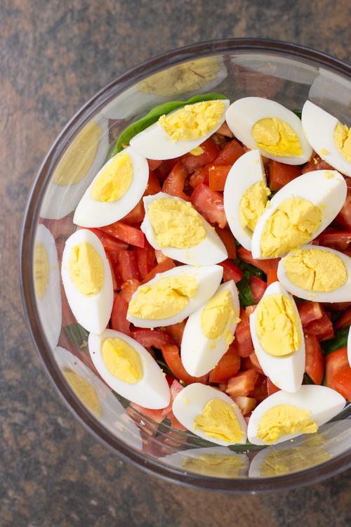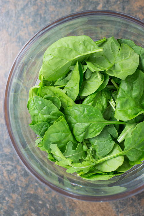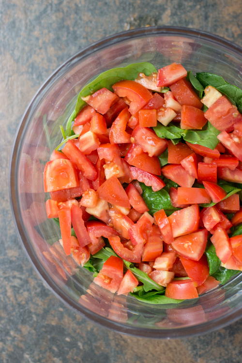 In a serving bowl, layer each of the seven ingredients starting with the spinach.