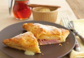 I love this baked version of the classic Monte Cristo Sandwich. The ham and melted cheese inside the puff pastry is marvelous. I make these with one slice of ham and one slice of turkey just to step it up a notch. I love the finishing touch of confectioner's sugar and maple syrup for that wonderful sweet and savory flavor.