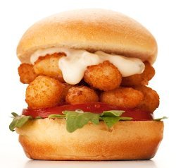 - Place lettuce, tomato, popcorn fish or shrimp on bun and add tartar sauce on top and then place bun on top.
