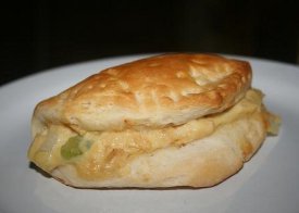 - Roll out each biscuit into a 6 inch circle. Place 1/2 cup tuna mixture on each dough circle; fold over and press edges to close.