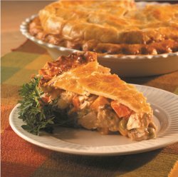 This savory pot pie recipe is a great way to make use of holiday leftovers and using yogurt in the gravy also helps lighten the calories from this hearty dish. With fresh sweet potatoes, carrots, celery, and peas, it's a great way to get the kids to eat vegetables.