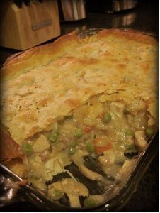 Remove the pot from heat and add peas and chopped chicken. Let sit about 2 minutes to set. Pour mixture into pie dish then cover with the second pie crust, careful to press the top crust down over the sides of the dish fully. Slit crust a few times to vent then brush with extra cream, melted butter or a beaten egg, whatever’s easiest.