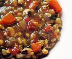 - Next, add the tomatoes, vegetable stock (or water), cooked black-eyed peas, celery seed, brown rice, ginger, allspice, thyme, mustard powder, cayenne, cumin, turmeric and hot sauce if using. Bring to a boil, reduce the heat to medium-low and cover and simmer for 30 minutes or so, stirring occasionally and adding more water or stock as needed.