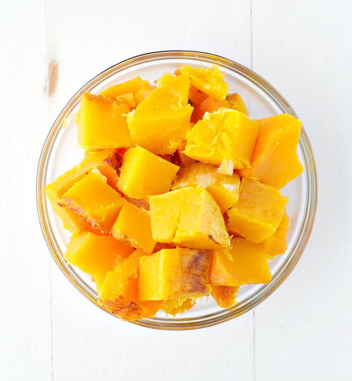 Allow squash to cool, peel the skin off, and cut squash into 2-inch cubes. Set aside.