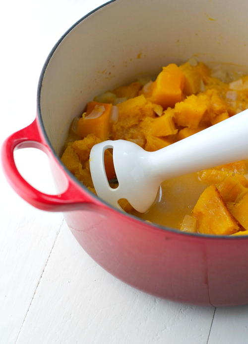 Puree stock with a handheld stick blender, or puree in batches in a regular blender or food processor, adding additional stock slowly until the soup reaches the desired consistency.