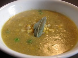 - In a large saucepan on medium-low heat sweat onion, celery, carrots, sage, potatoes, lemon zest, cayenne pepper, salt and pepper with butter until the onion becomes translucent.