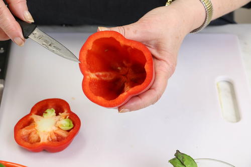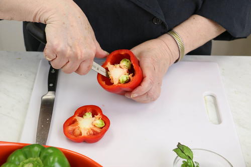 Cut the tops off the peppers and clean out the seeds and ribs.