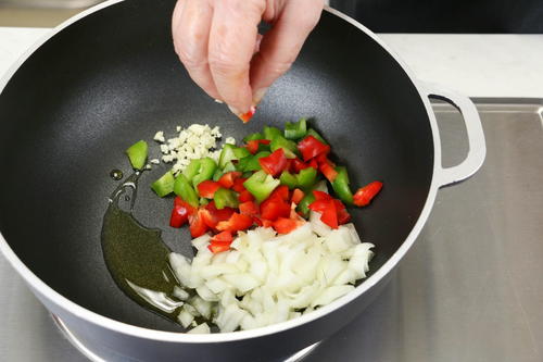 In a medium skillet heat the oil over medium high heat and sauté the onion, garlic and chopped pepper until beginning to brown, about 3 minutes.