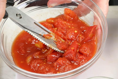 Use a kitchen scissors to cut the tomatoes into small pieces.